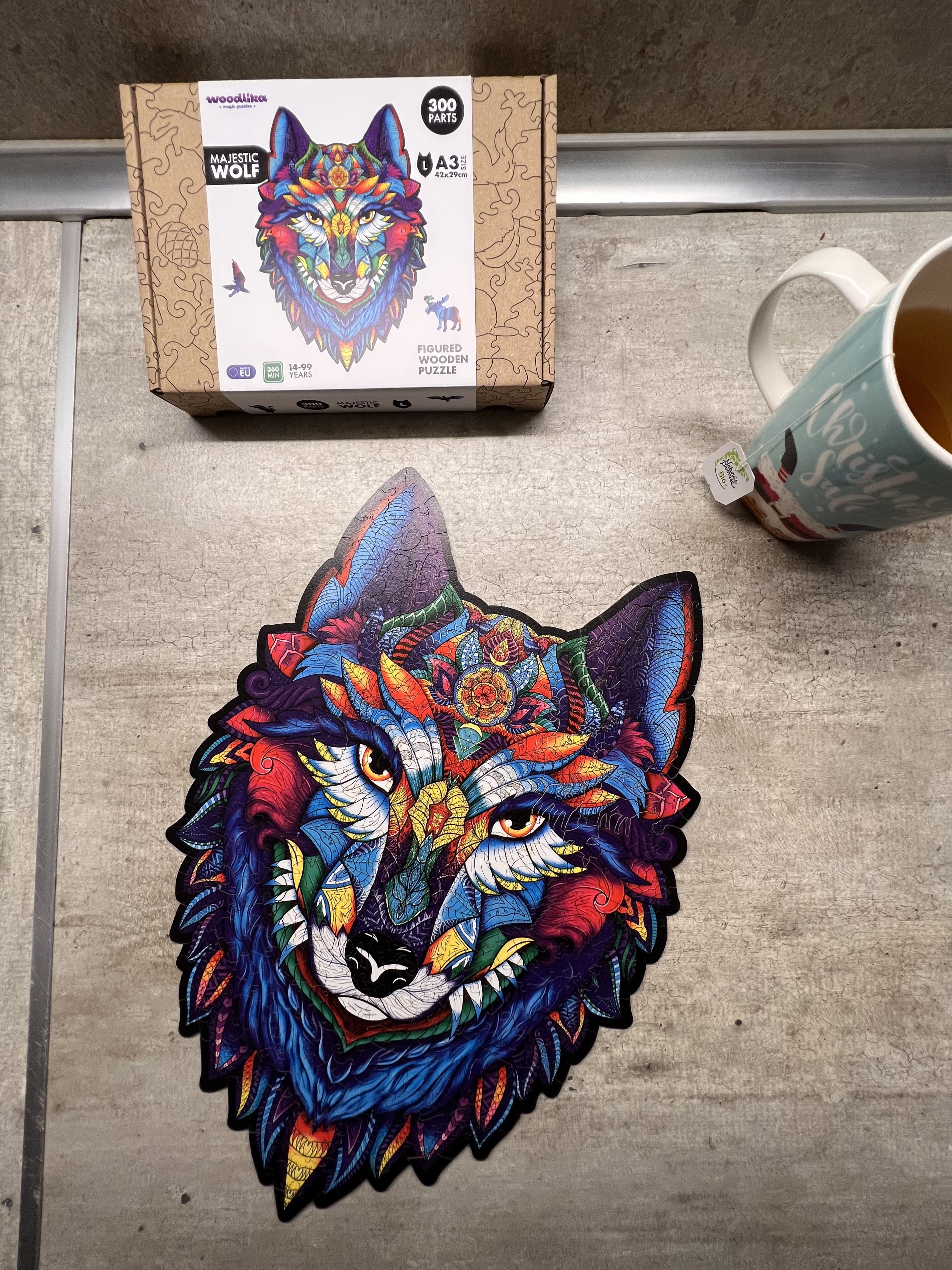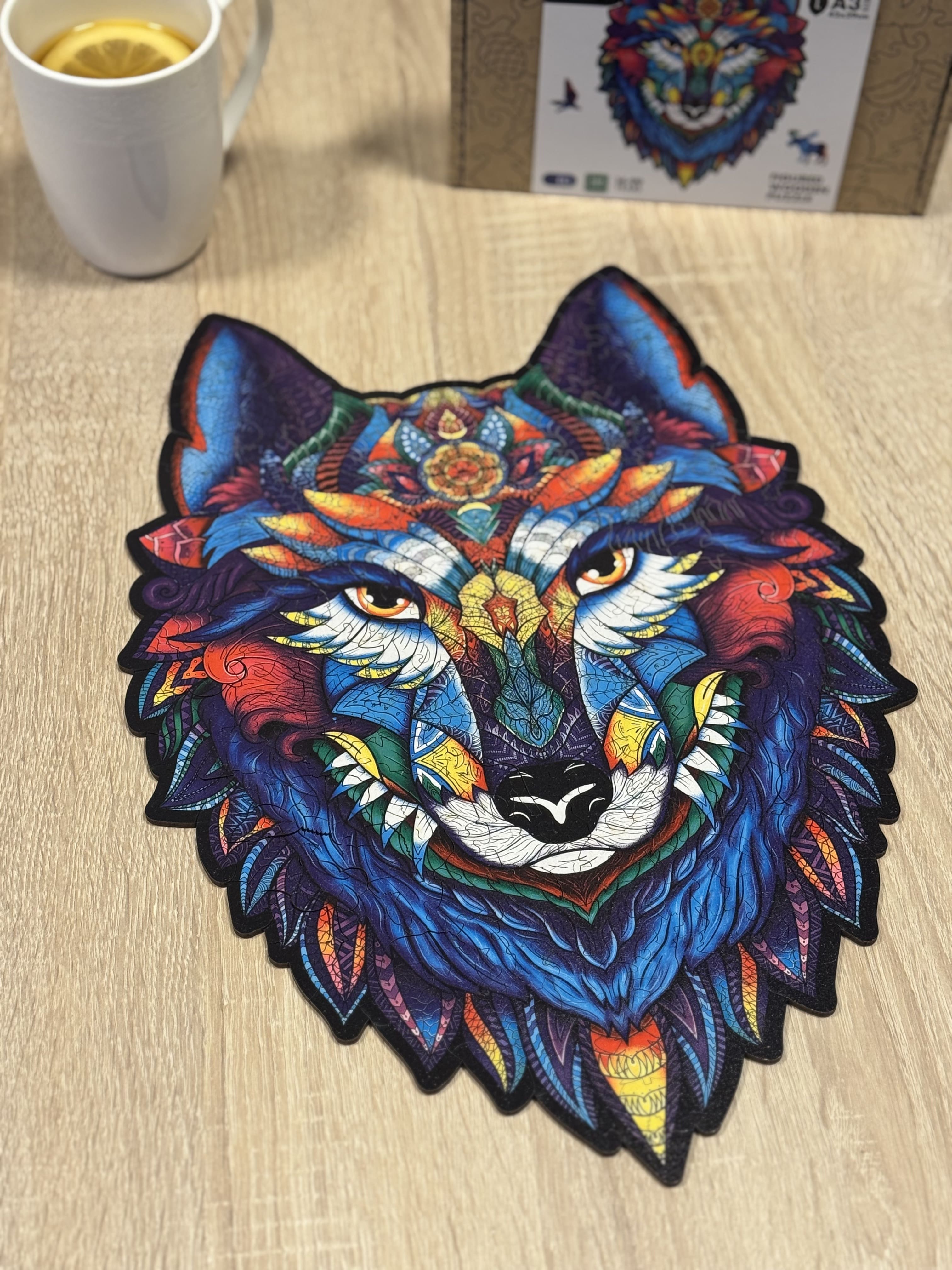 Mystický vlčí svet. Prémiové drevené puzzle zo 160 unikátne tvarovaných dielikov s tématikou tajomného lesa. Až 4 hodíny zábavy pre celú rodinu. Vyrobené a certifikované v Česku. Velikost A4 ≈ 29×21 cm.